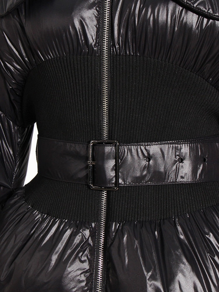 Μπουφάν φουσκωτό μεσάτο με ελαστικό πλεκτό στην μέση και ζώνη , μακρύ μανίκι και λεπτομέρειες απο πλεκτή μανσέτα.