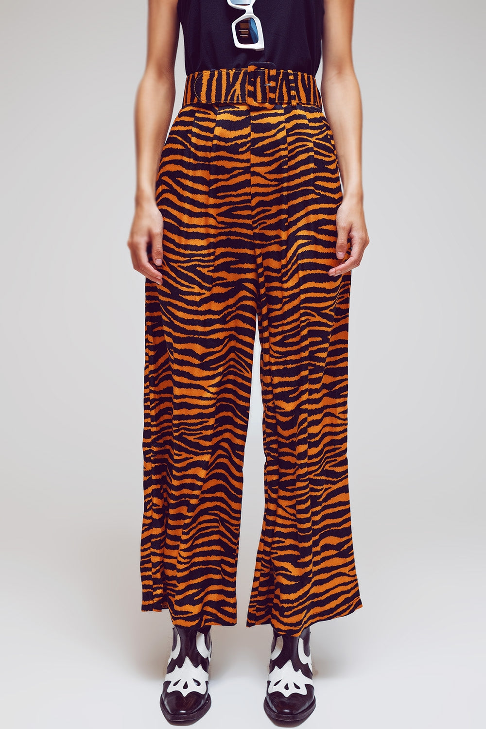 Animal Print Straight Leg Pants With Wide Buckle Belt