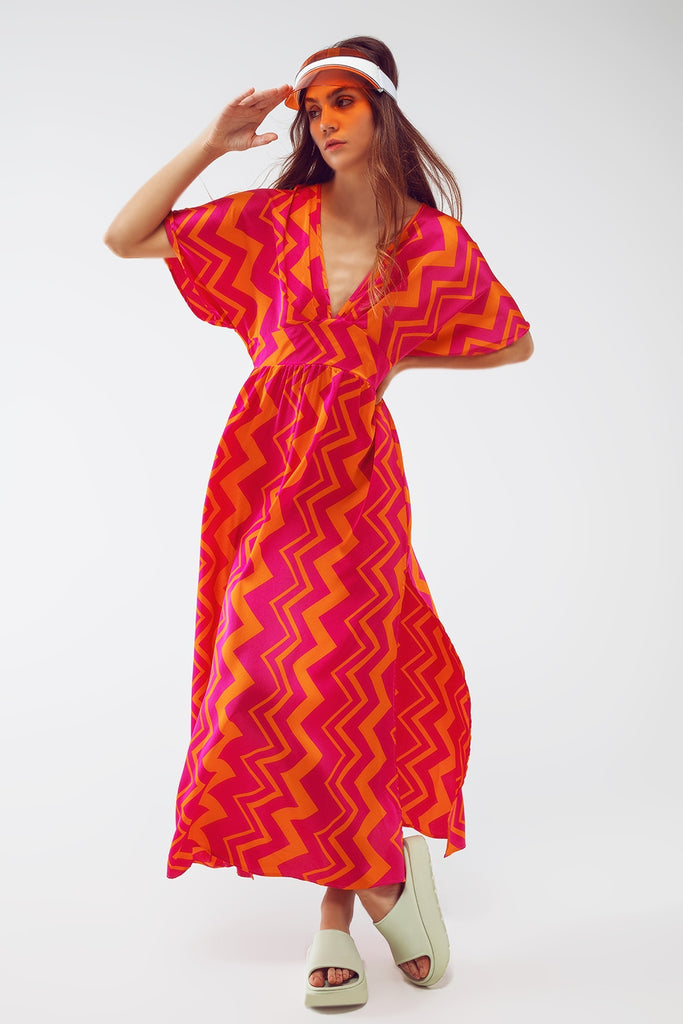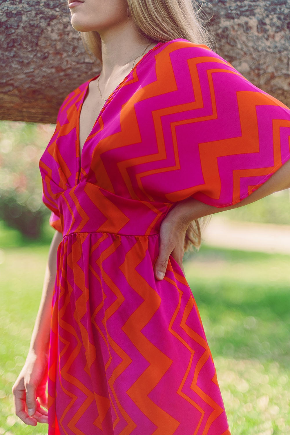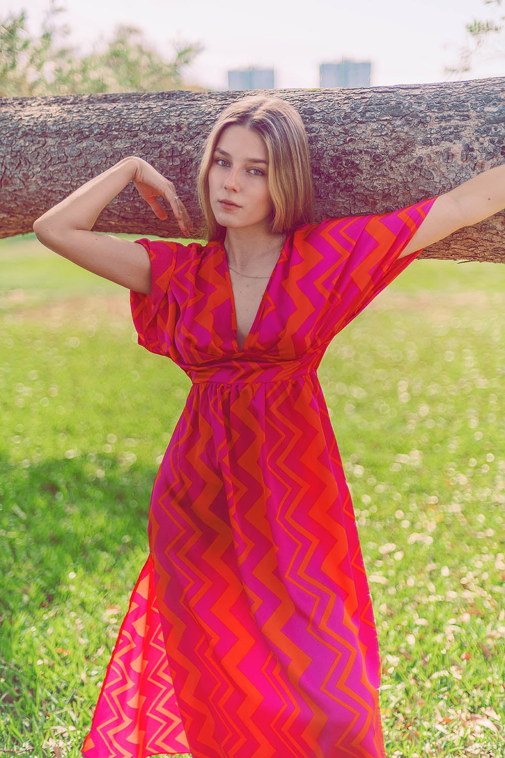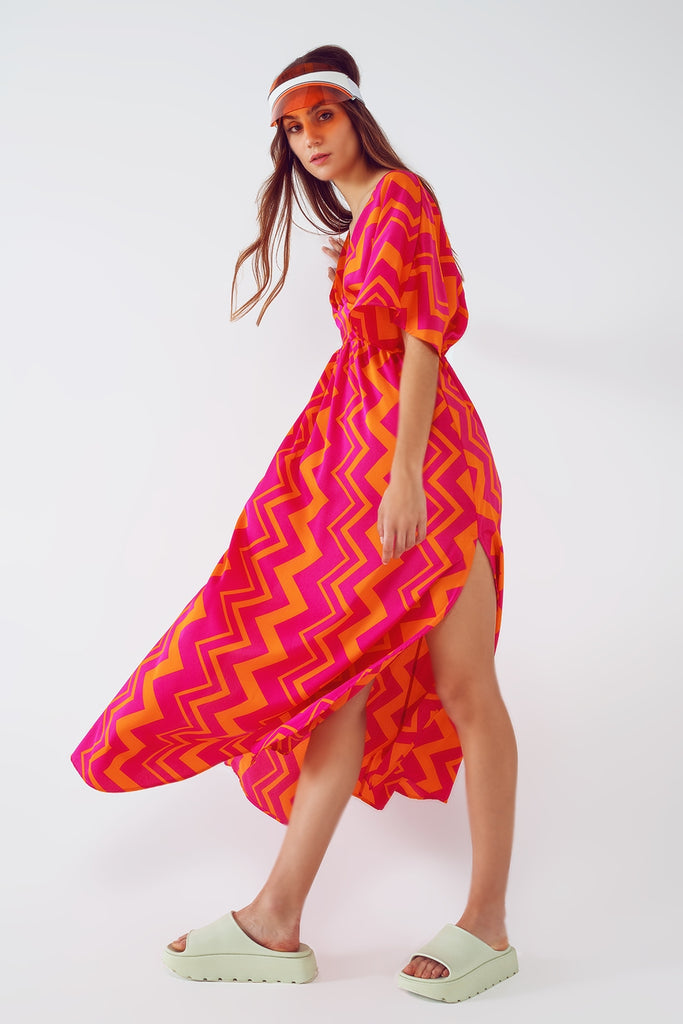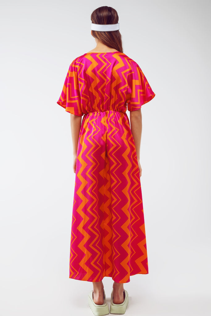 Maxi V-neck Dress Cinched At The Waist In Zig-Zag Fuchsia Orange Print