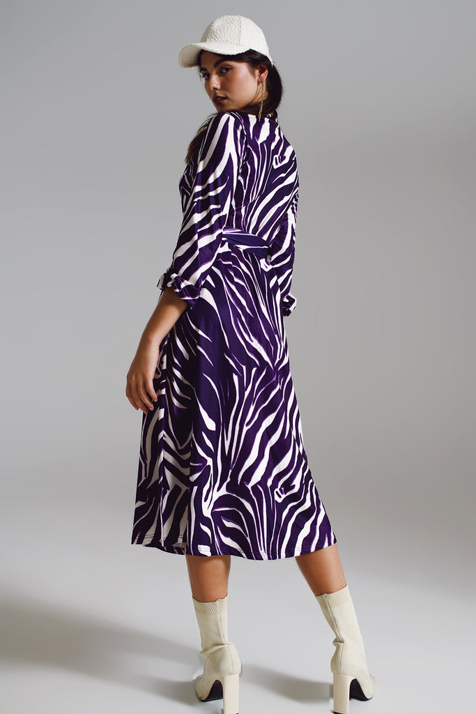 Midi Belted Wrap Dress in Purple and Cream Zebra Print
