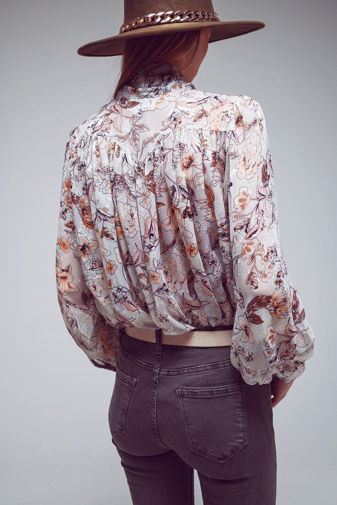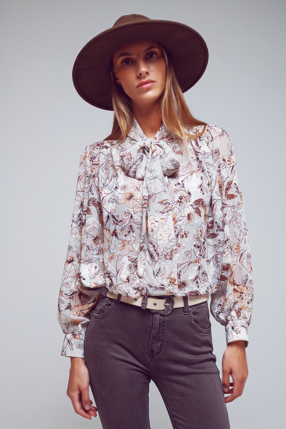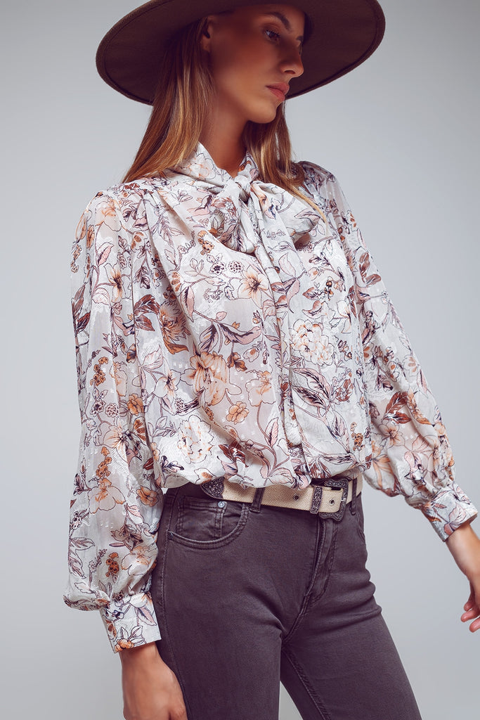 Shirt With Tie Neck And Long Sleeves In Cream Flower Print
