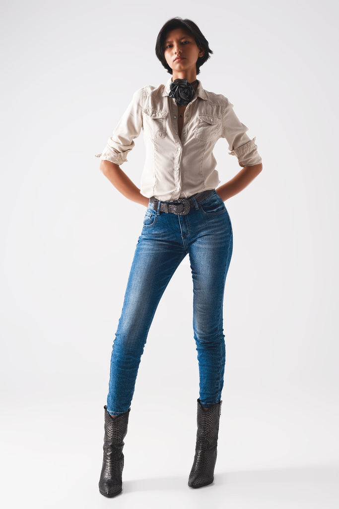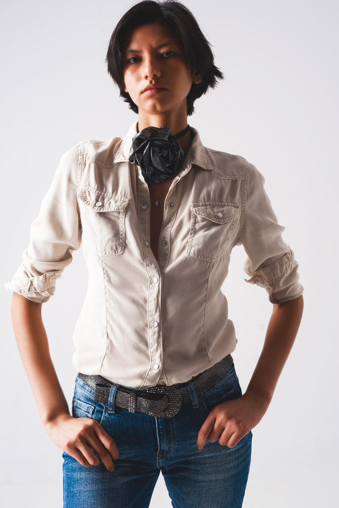 Subcategory: Shirts. Neck: Wide collar neckline. Sleeves: Long Sleeves. Fit: Bodycon fit. Style: Casual. Fabric: Stretch denim. Pockets: Chest pockets. Zipper: Press-stud placket. Product details: Functional pockets. runs small. S.