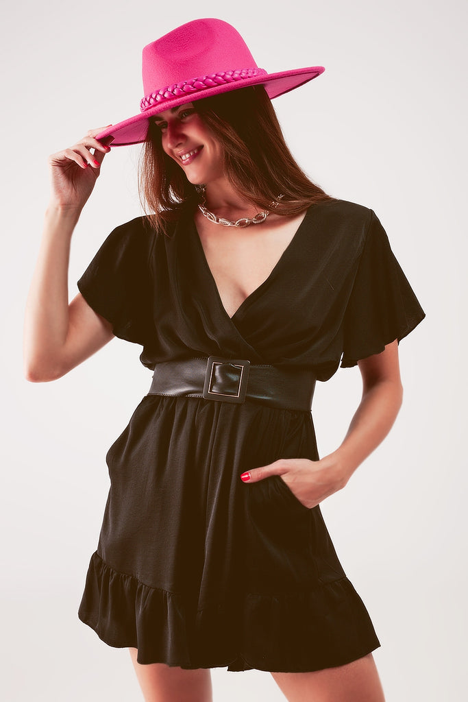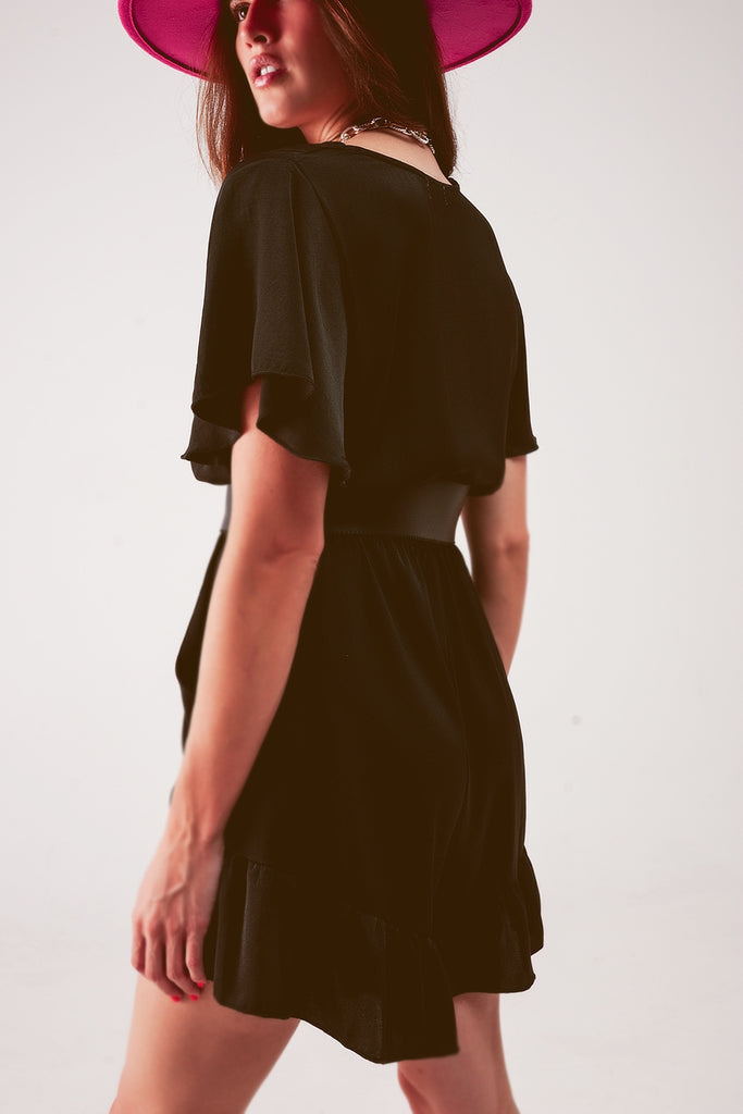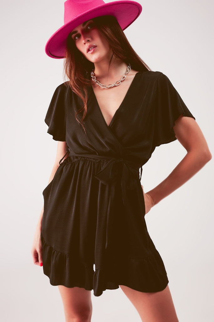 Length: Cropped length. Subcategory: Playsuit. Neck: V-neck neckline. Sleeves: Angel sleeves. Fit: Wrap front. Style: Romantic. Detail: Belt of same fabric included. Fabric: Satin . Pockets: Side pockets . Zipper: Tie fastening . Seam: Frill trim. Product details: Functional pockets. Waist: Elastic waist. runs true to size. S.